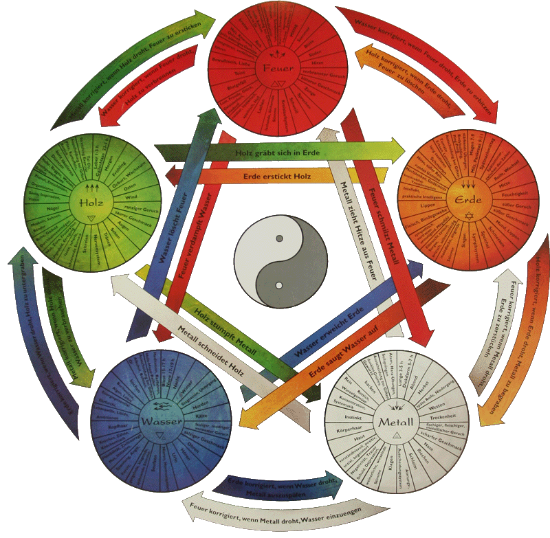 - Die fünf Wandlungsphasen jedoch bedeuten, dass die Elemente in lebendiger Beziehung, in einem fließenden Gleichgewicht zueinander stehen und sich gegenseitig erzeugen und beeinflussen.